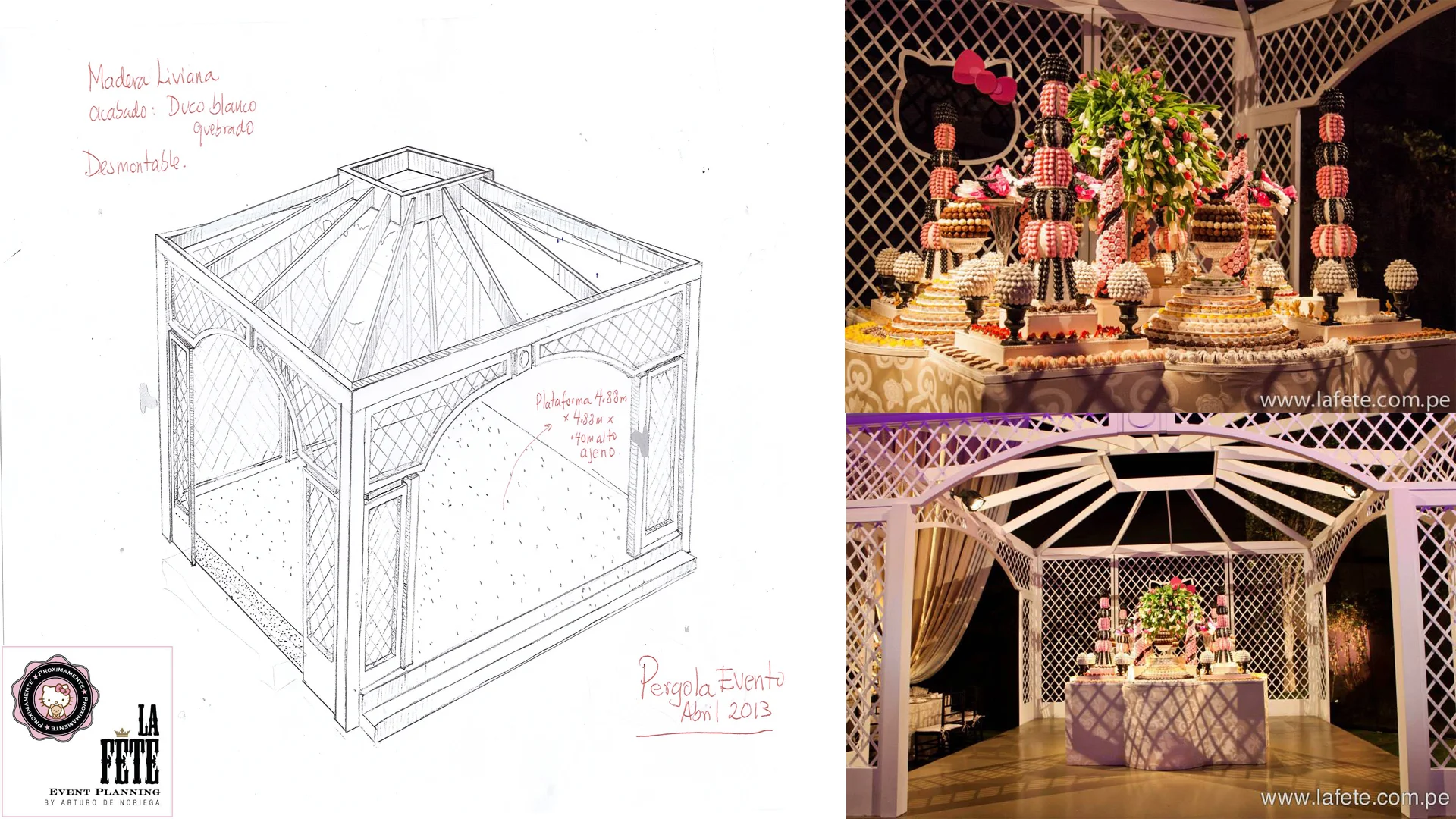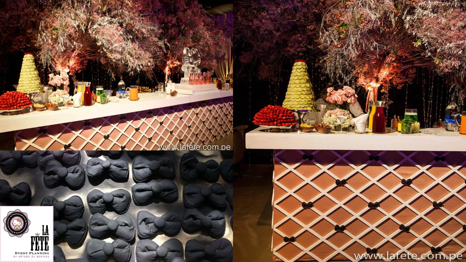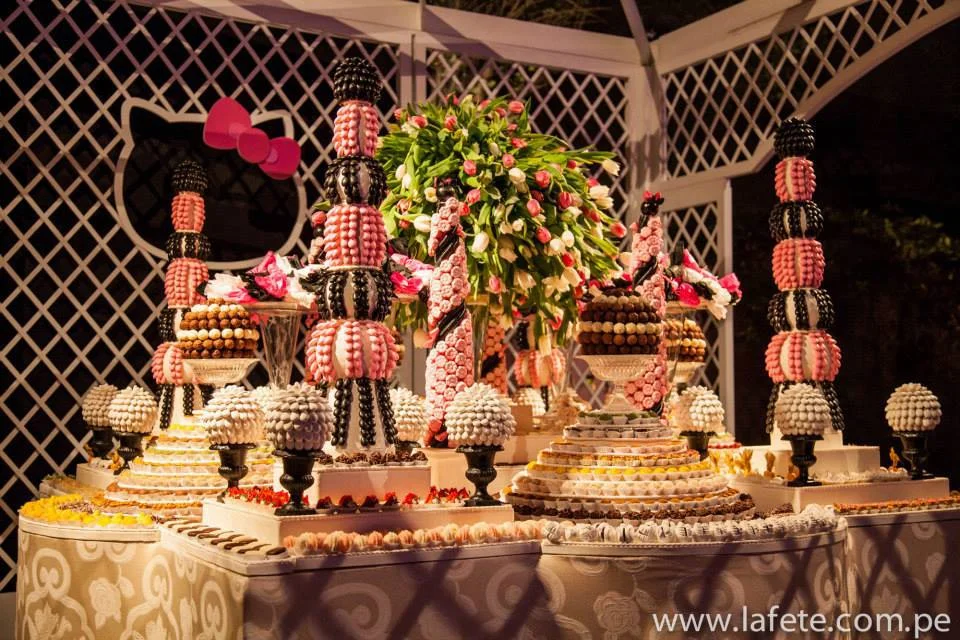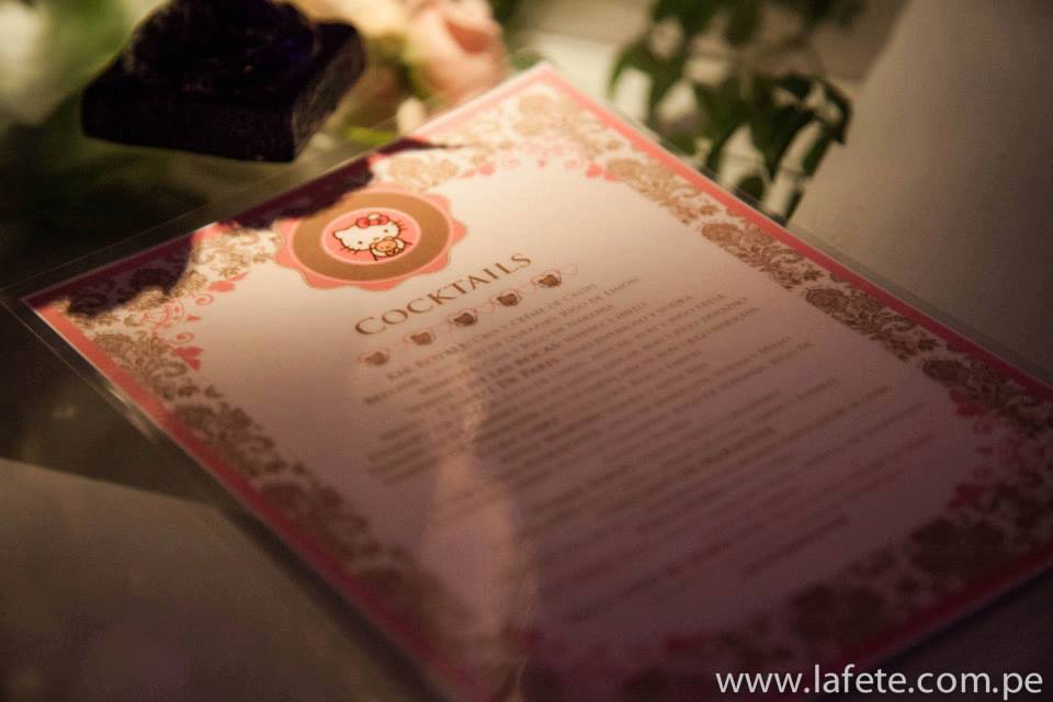 Cuando nos embarcamos en crear una fiesta centrada en el persona mundial mente reconocido de la artista Yuko Shimizu, teníamos una idea acerca del concepto inicial, pero como toda idea, este fue cambiando hasta que la final decidimos crear algo verdaderamente único centrado alrededor del personaje principal: Hello Kitty. Dado que el personaje y la audiencia esta orientado hacia un publico menor, implementamos sutilmente elementos del personaje y de su mundo, sobretodo de colores, es este caso: Palo Rosa, Blanco y Negro.