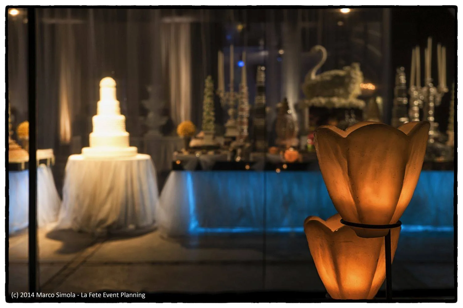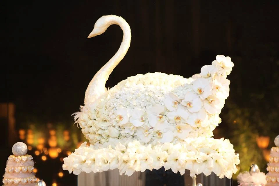 Fiel al concepto, recreamos un ambiente fiel al Lago. La presencia de cisnes era prevalen te, sobretodo en la entrada, donde confeccionamos una pareja de estas divinas aves hecha en flores.