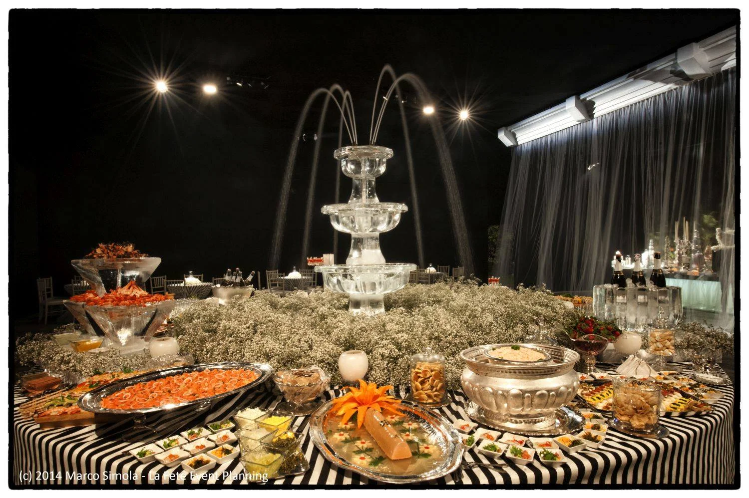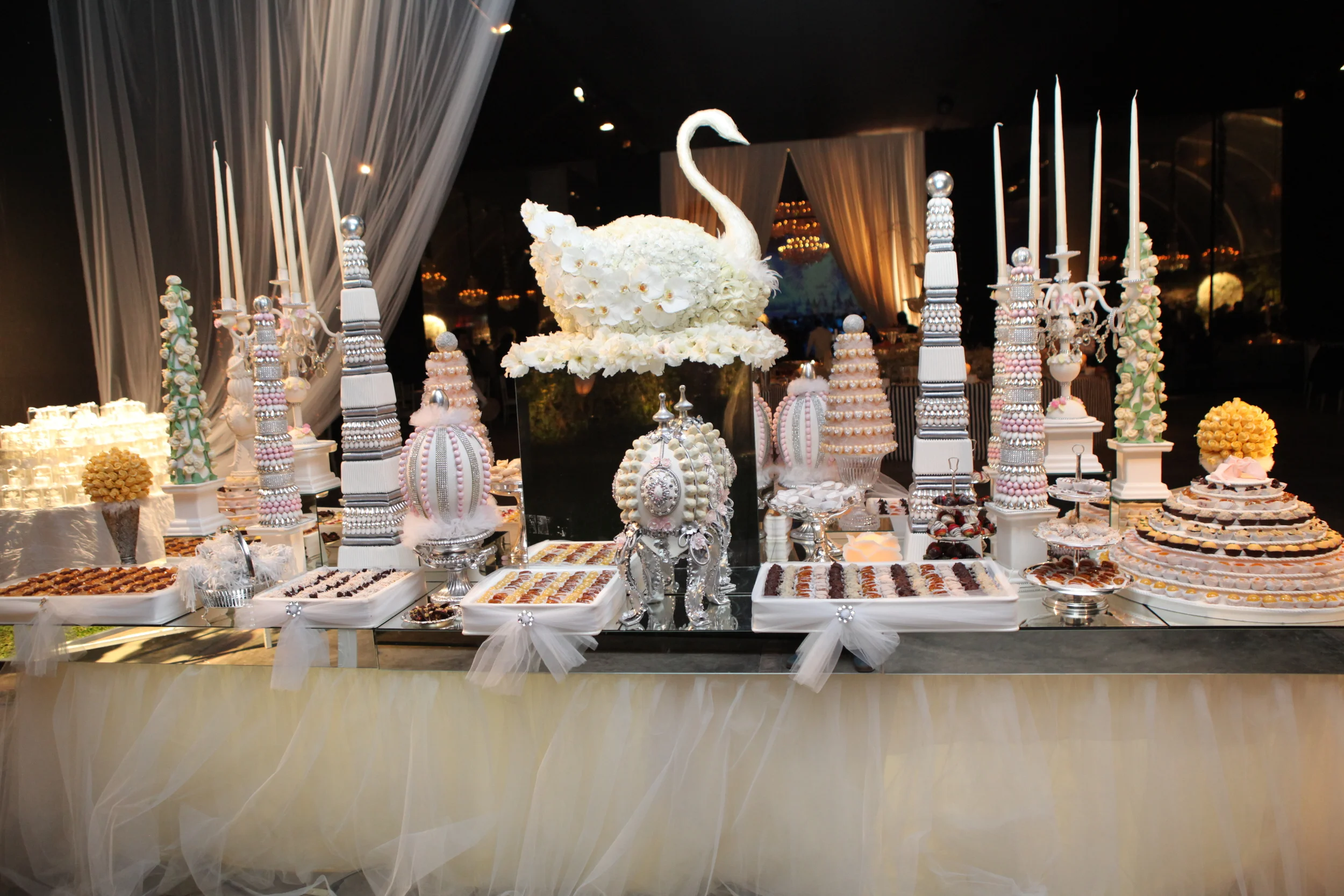 Las plumas fueron un fuerte referente, presentes también durante la fiesta. Fiel a la obra dé Tchaicovsky y a su acto final, se emplearon plumas negras al igual que blancas.