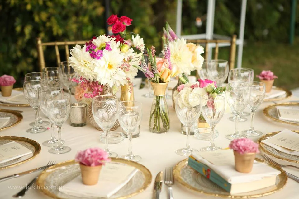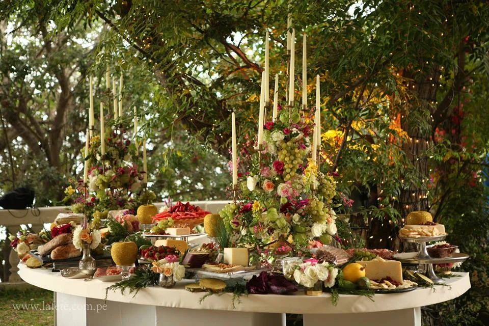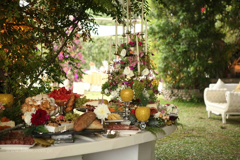 Para este evento, empleamos el oro en todos sus aspectos. Las sillas doradas fiel a la temática de la fiesta, el pan de oro representativo del Perú en los platos hecho por la madre del novio, Rosario....y velas, fue un detalle recurrente en la escenografía. Las velas, con luz natural resaltaban el otro en el perfecto angulo, creando una luz tenue en un ambiente elegante, bohemio chic y memorable.