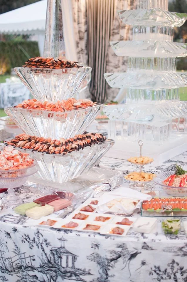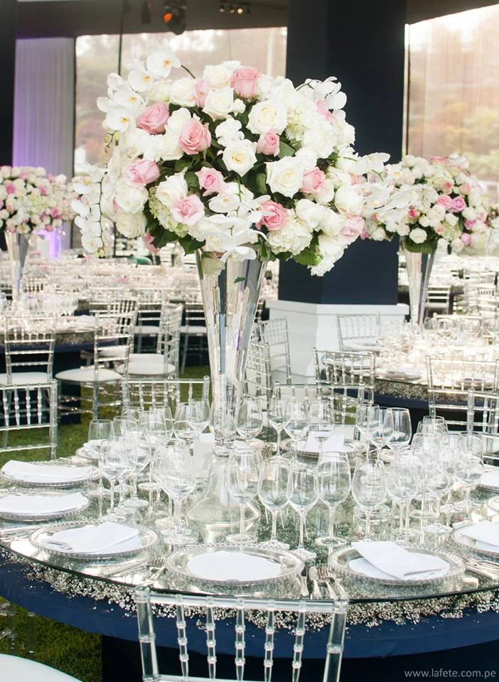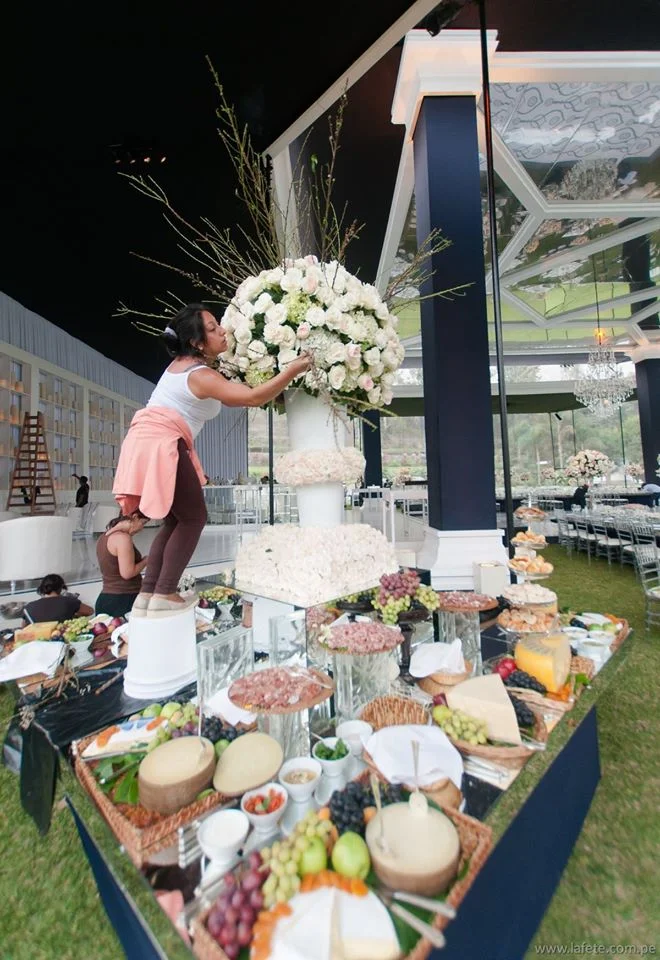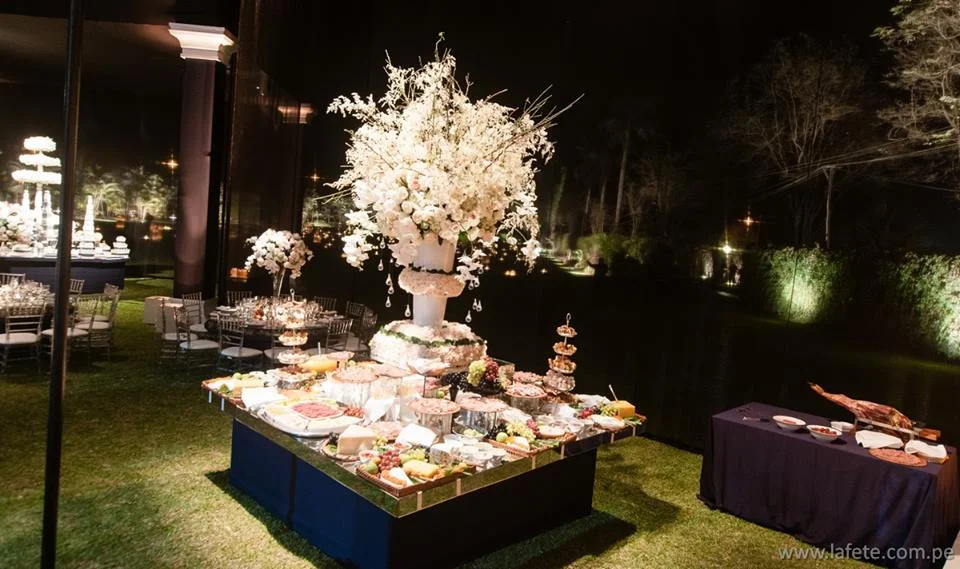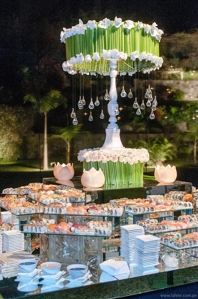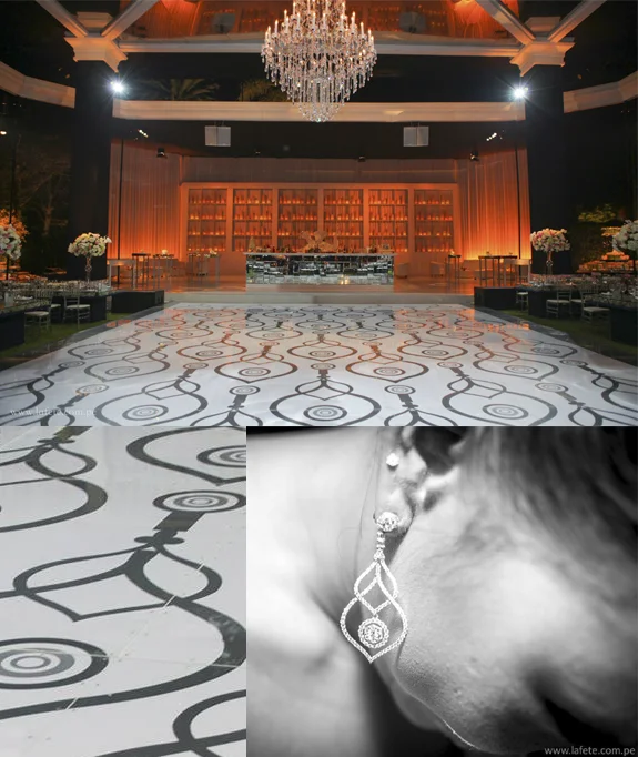 Para la puesta en escena utilizamos un concepto diferente inspirado en el Hotel Viceroy de los ángeles en donde una gama de espejos recubrieron no solo la barra, sino el techo de la fiesta creando una atmósfera visual que invitaba a los invitados a una realidad distinta y evocando nuevamente la obra de Carrol. Asimismo, usamos aproximadamente 400 orquídeas, uno flor con muchos significados, pero en este caso, nos enfocamos en la belleza y la seducción. Utilizamos la presencia de un Dragon Chino de mas de 2 metros de largo, arreglos florales diferentes para cada estación reflejando una noche llena de glamour, elegancia y felicidad por parte de los novios y sus familiares.